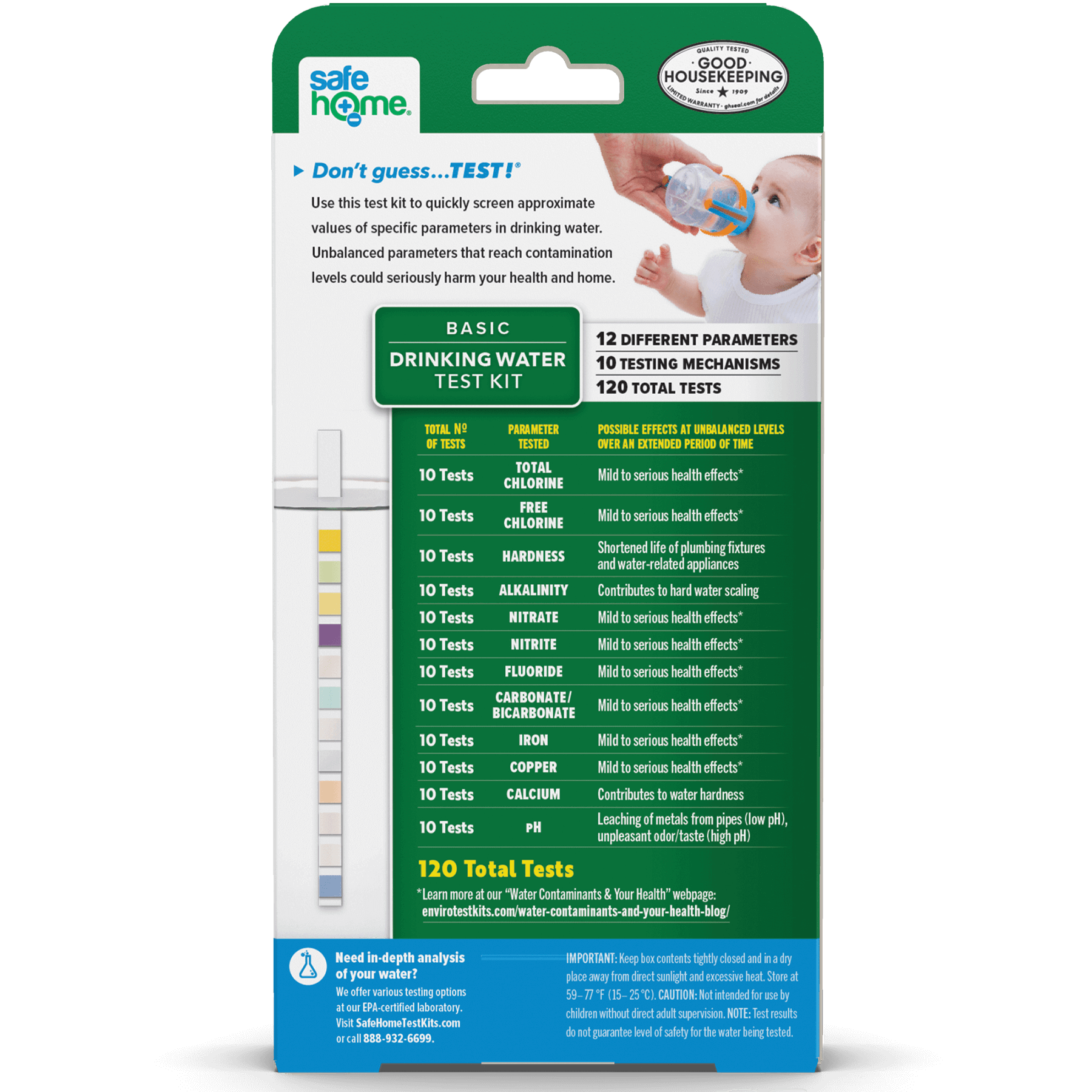 This water testing kit for drinking water puts the control back in your hands. It’s easy to use and provides rapid, accurate results. Whether you’re concerned about chlorine, nitrite, fluoride, hardness, alkalinity, iron, pH, carbonate/bicarbonate, copper, nitrate, or calcium, the Safe Home® BASIC 120 Water Quality Test Kit equips you with the essential tools to safeguard your water quality.